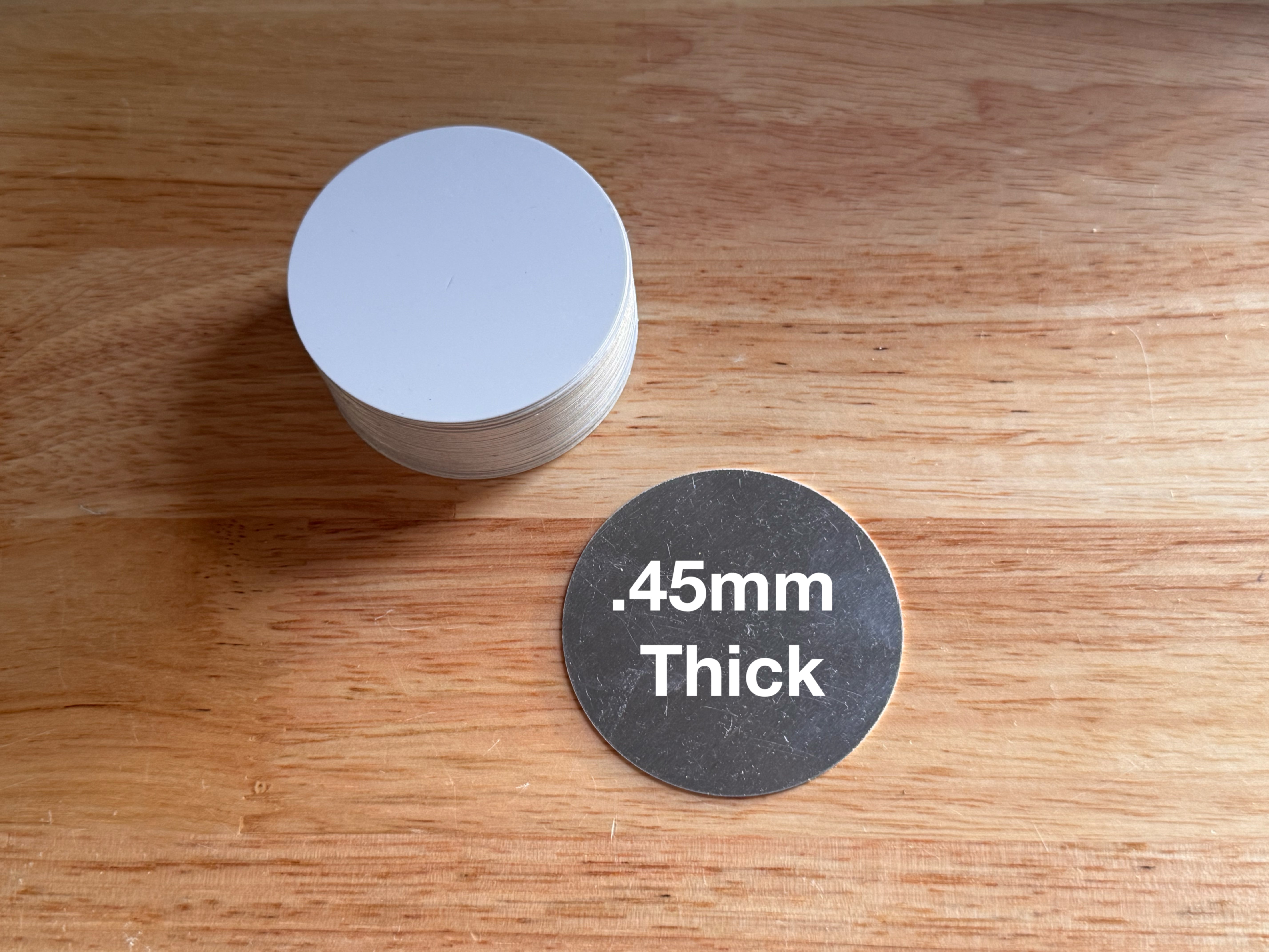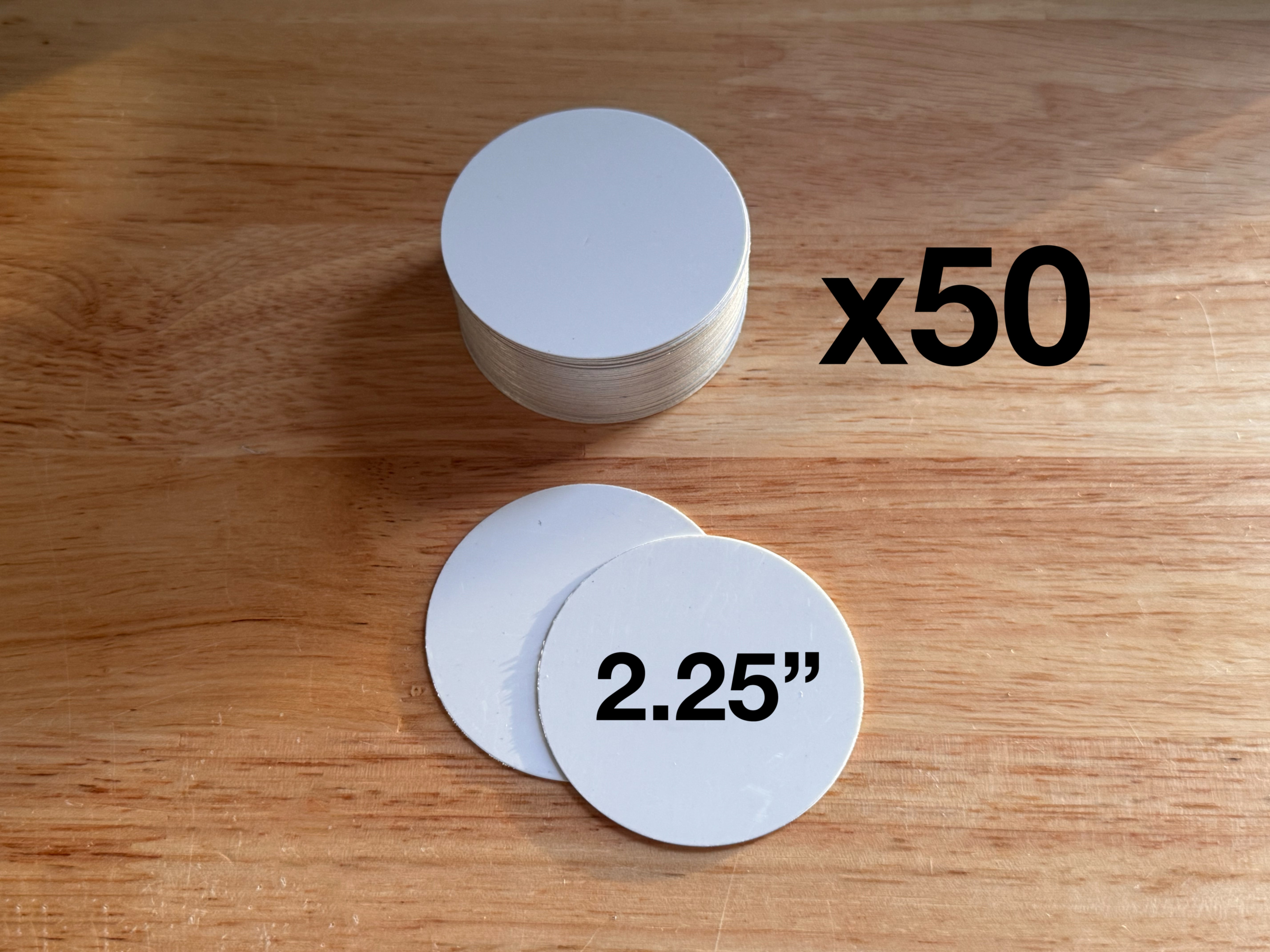 Precision-engineered sublimation disc inserts designed for professional heat transfer applications. This 50-pack bundle features 2.25" round blanks with a robust 0.45mm thickness, providing optimal durability and dimensional stability during the sublimation process. The hole-free design offers maximum flexibility for custom applications and prevents unwanted ink transfer at contact points. Ideal for creating personalized coasters, decorative discs, and specialty items with vibrant, long-lasting color reproduction. Each insert maintains consistent quality standards for reliable batch production.