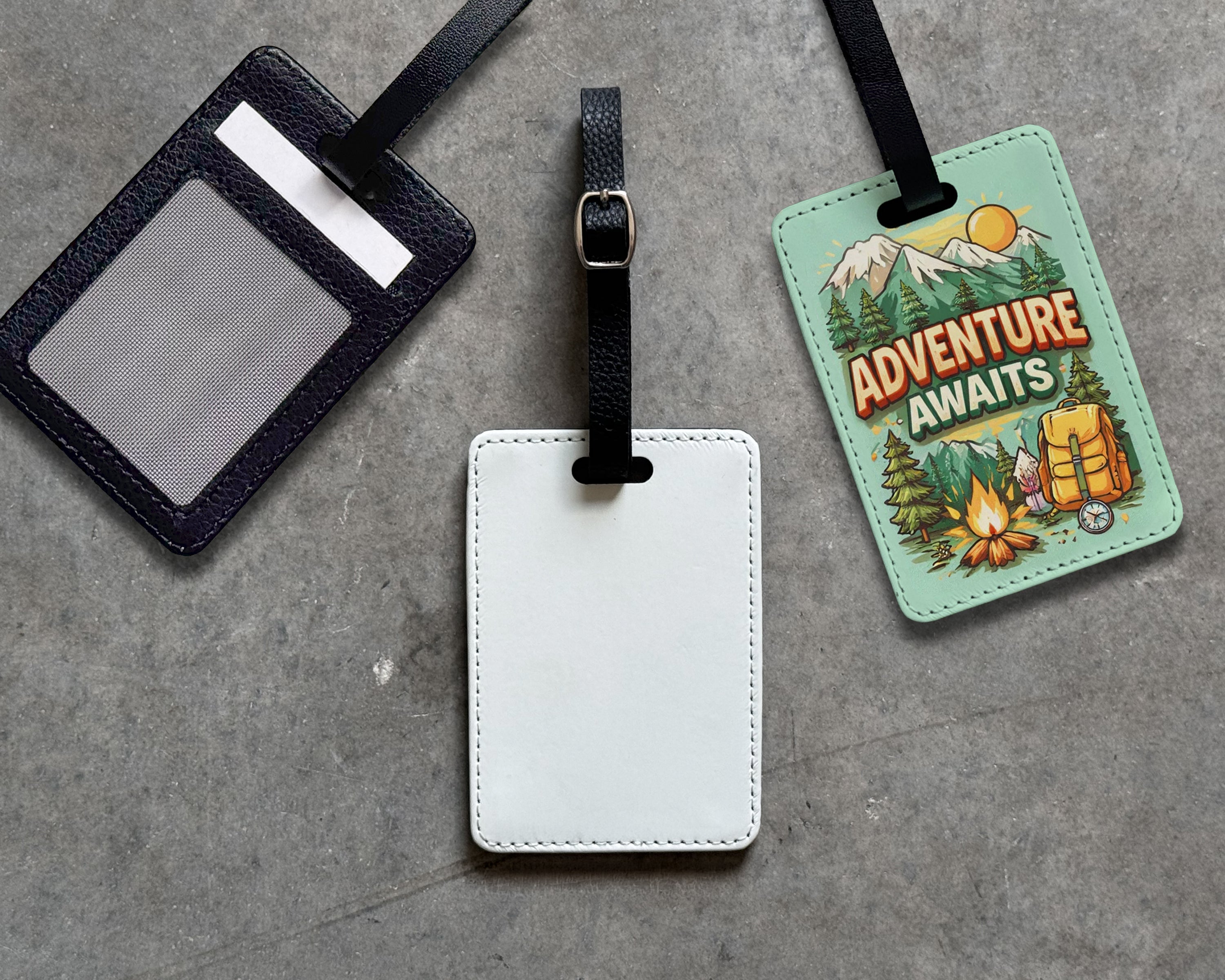 Customize your travel essentials with these blank sublimation luggage tags. Each 4" × 2.6" tag features a smooth, front surface perfect for vibrant, personalized designs. The durable vegan leather construction withstands airport handling, while the adjustable black strap secures easily to any luggage. A convenient slot on the back holds your contact information card for added security. Ideal for travel businesses, event organizers, or anyone wanting branded luggage identification. Pack of 10.